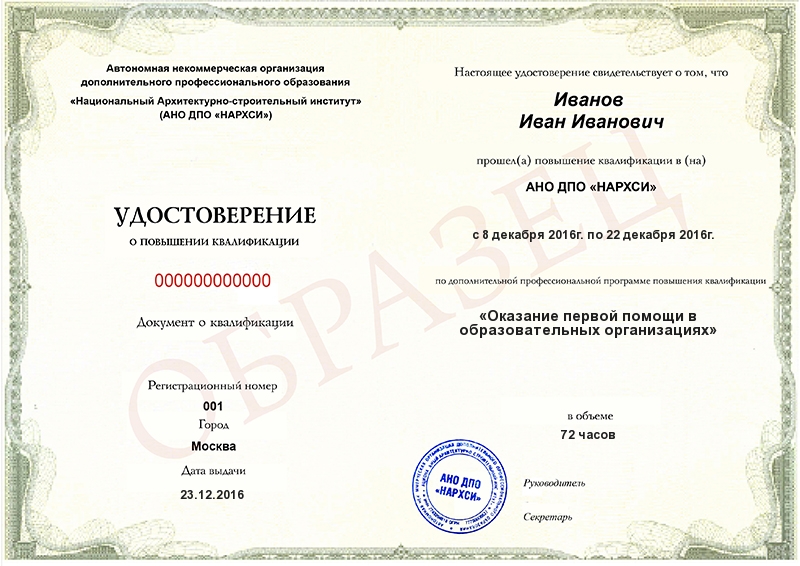 Удостоверение о повышении квалификацииУдостоверение действует на территории всей России и признается государственными и частными организациями.