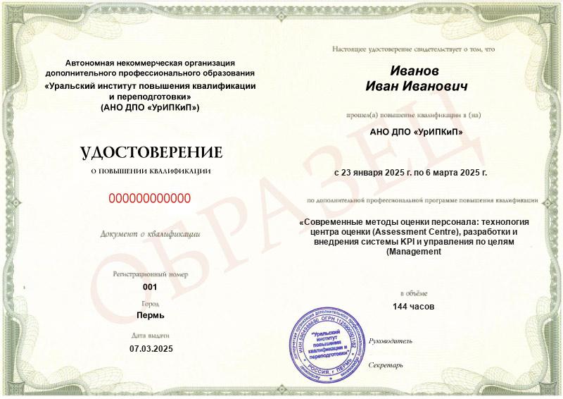 Курс обучения Современные методы оценки персонала: технология центра оценки (Assessment Centre), разработки и внедрения системы KPI и управления по целям (Management by Objectives) (144ч)